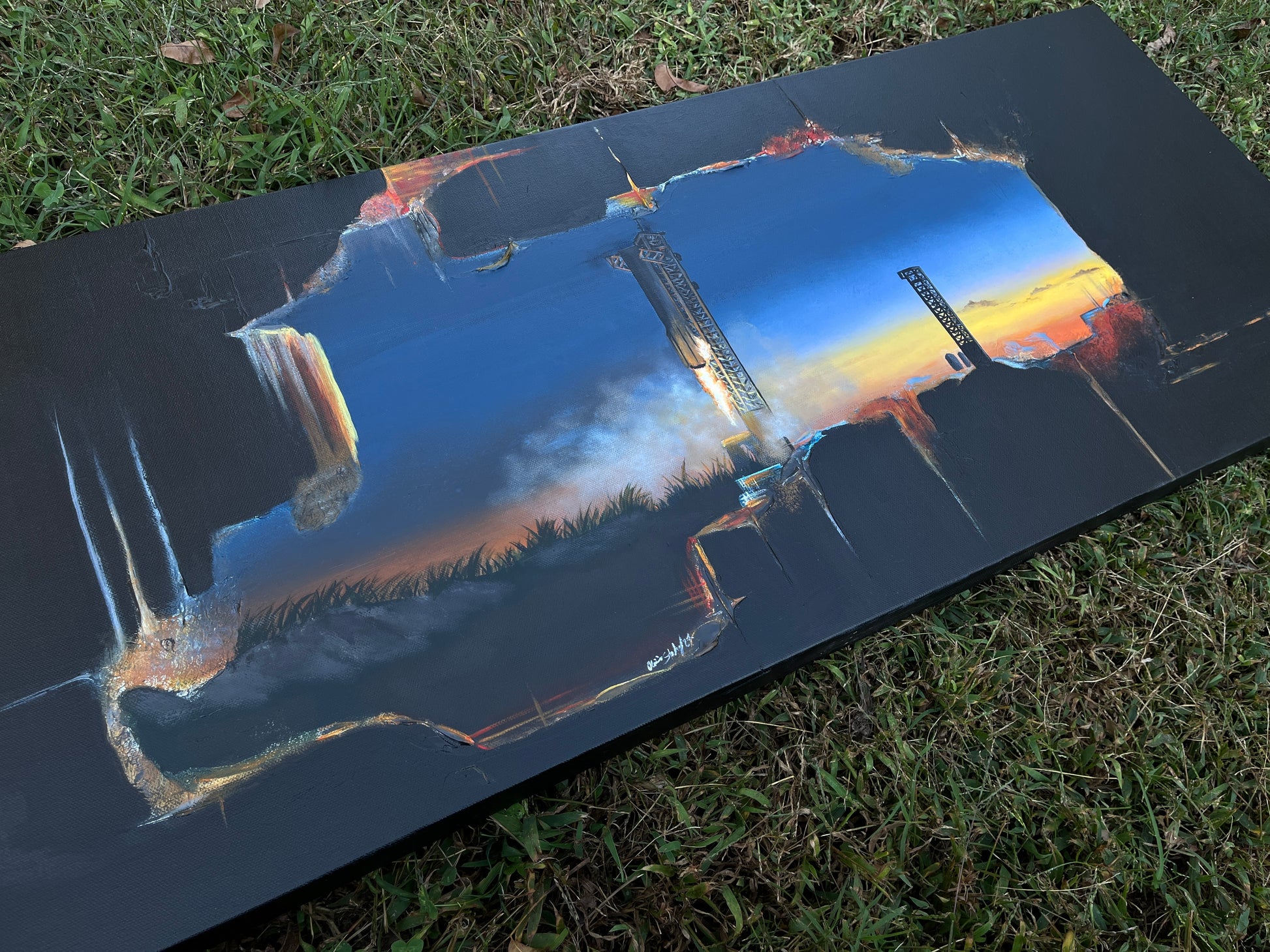 This painting was incredibly fun to do. When I sat down I wasn’t really sure HOW I wanted to paint the booster catch, I just knew that was the goal. I used two reference images by the incredible John Krauss and C Nunez (Starbase Surfer) a nighttime static fire video to create this. The textured “framing” was something I just sort of came up with while working. Did it turn out exactly how I pictured? No. However, I really don’t hate the way it turned out.